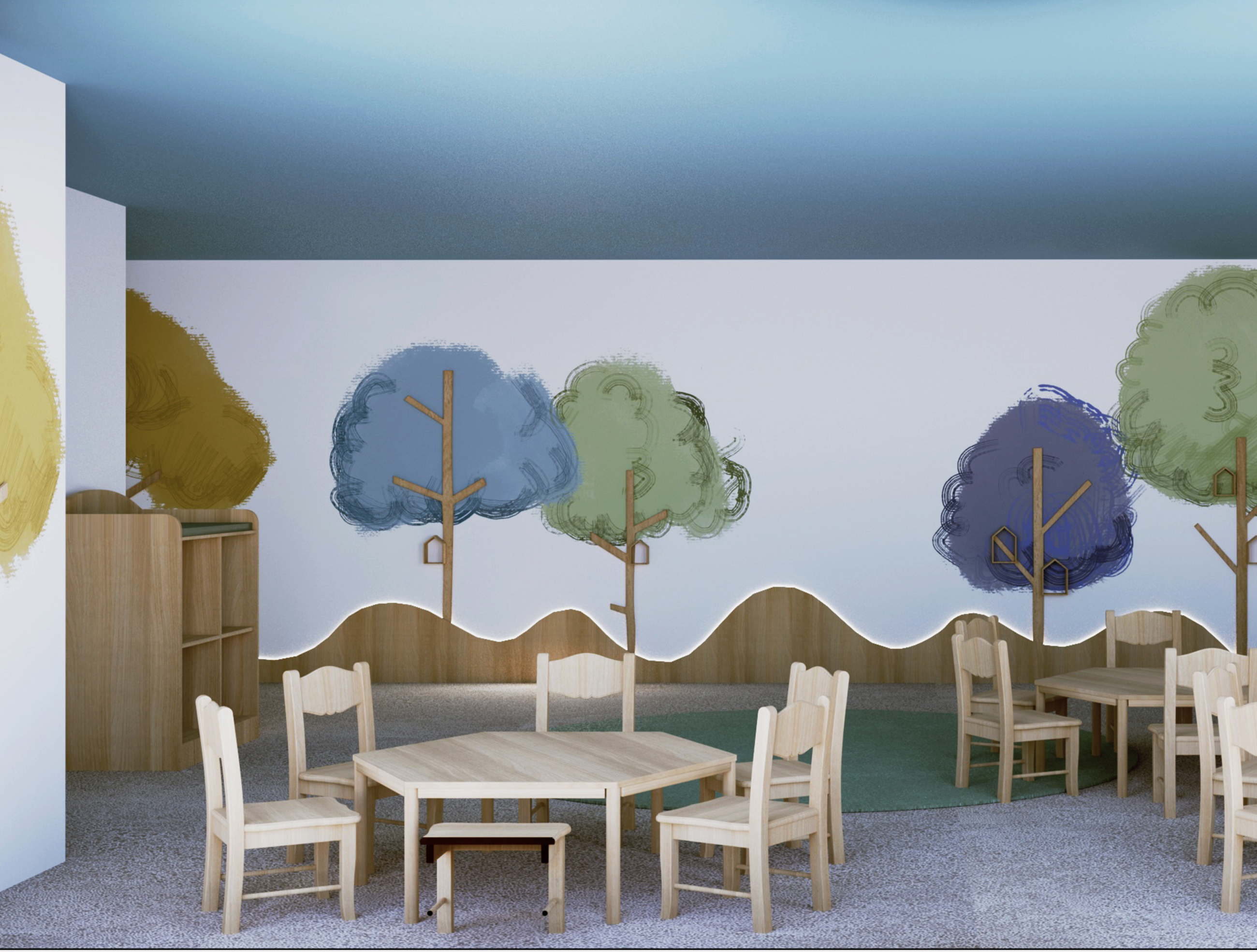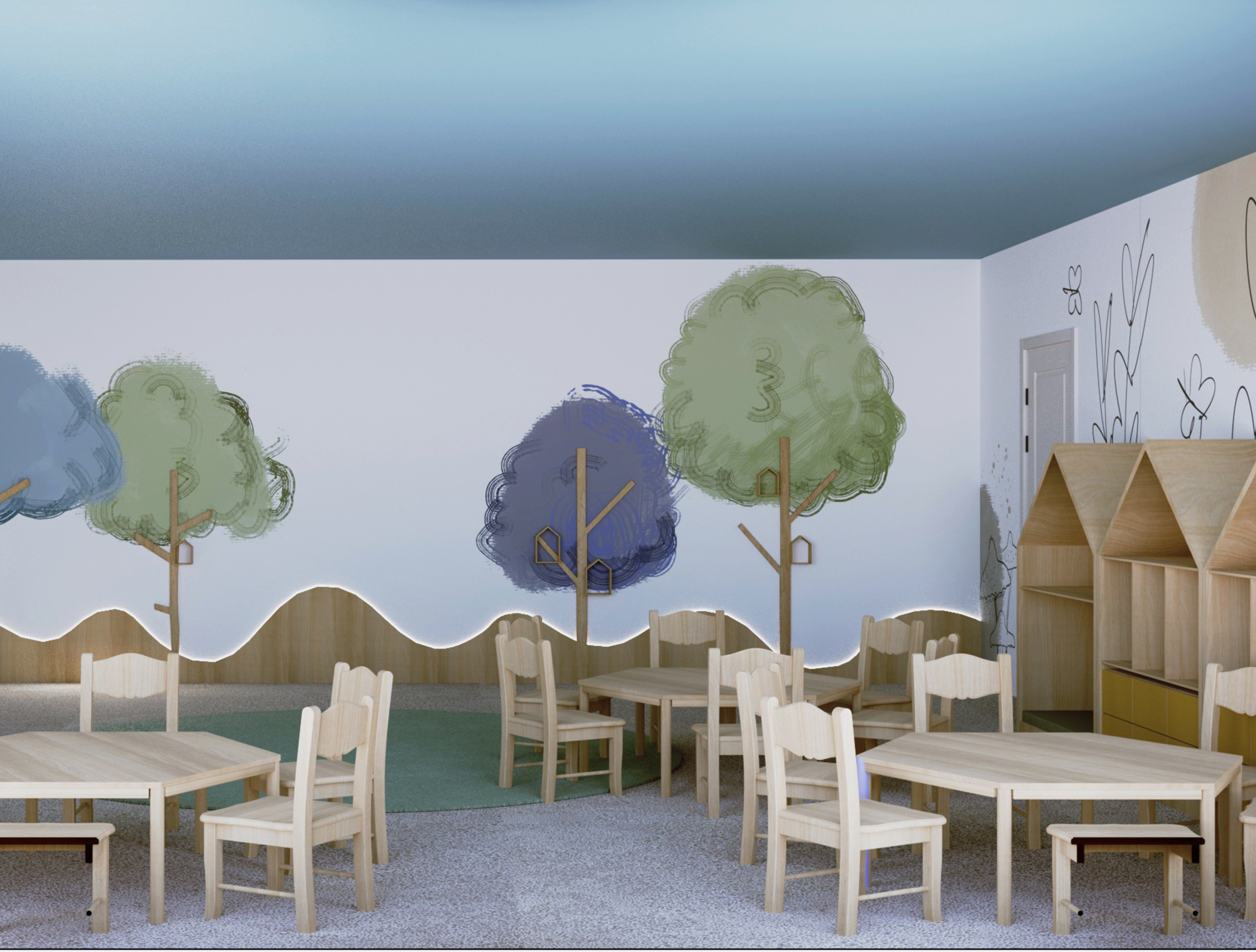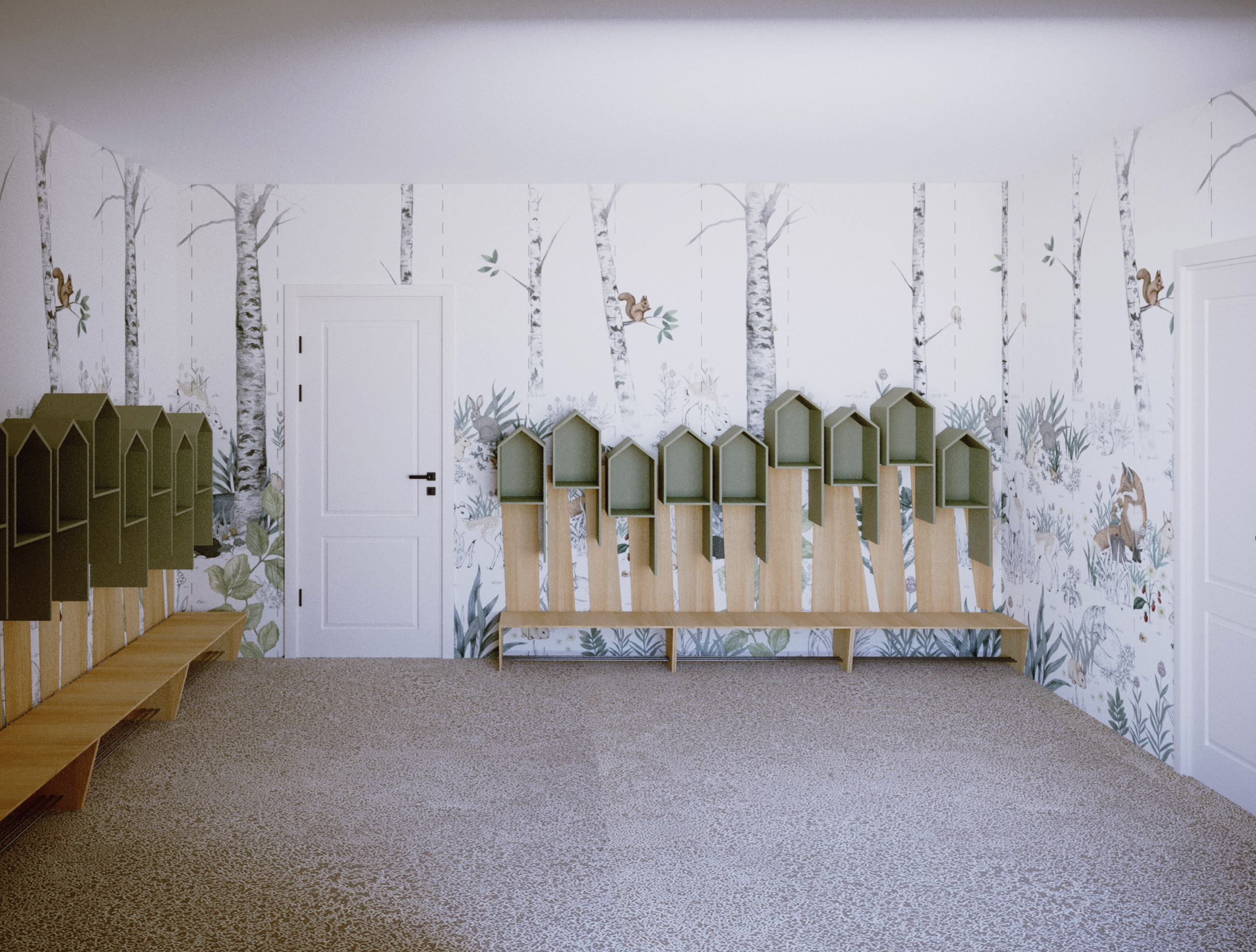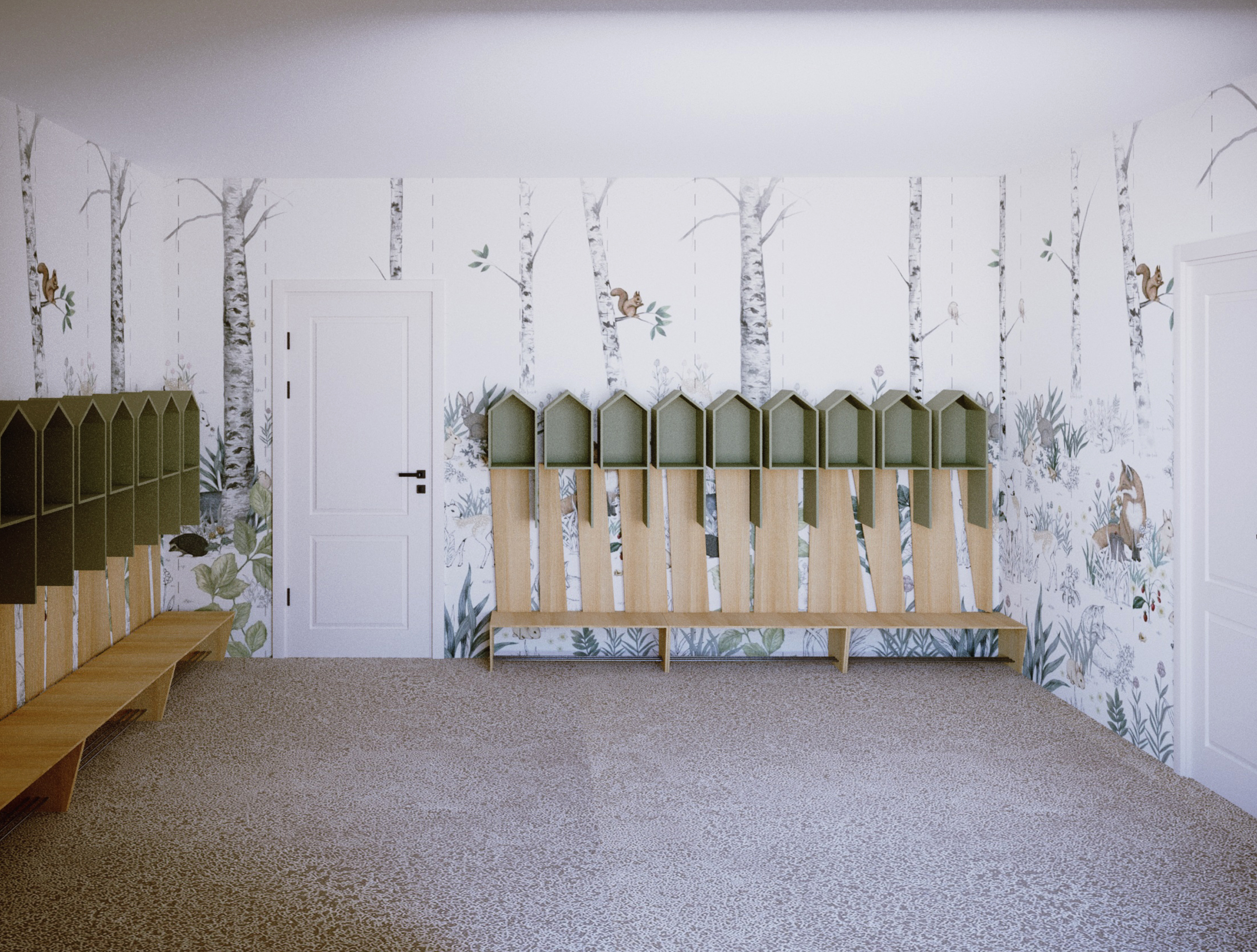 Projekt Żłobka „Bystre Smyki” – Tworzymy Przestrzeń dla Rozwoju Maluchów! Celem w tym żłobku było stworzenie przestrzeni, która nie tylko zachwyca wyglądem, ale także wspiera rozwój i bezpieczeństwo najmłodszych, oraz można ją dostosować z dekoracją natury i cyklu miesięcyw roku.. W żłobku „Bystre Smyki” zaprojektowaliśmy wnętrze pełne natury, harmonii i inspiracji do odkrywania świata. Jasne, pastelowe stonowane kolory, delikatne akcenty w postaci drzew i domków dla ptaszków na ścianach, a także przytulne kąciki dla dzieci sprzyjają poczuciu komfortu i bezpieczeństwa. Układ Funkcjonalny oraz każdy detal został starannie przemyślany. Praktyczne półeczki i schowki, ergonomiczne stoliki oraz siedzenia – wszystko to zaprojektowane z myślą o wygodzie i funkcjonalności. Elementy natury, takie jak motywy drzew i domki dla ptaszków, wprowadzają spokojny, przyjazny klimat, a dzieci mogą poczuć się jak w bajkowym lesie. Projektowanie żłobka to wspaniały proces twórczy, ale też wymagający doświadczenia i wyczucia. Wiemy, jak przekształcić przestrzeń w przyjazne środowisko, które wspiera rozwój i wyobraźnię dzieci. Zapraszamy do współpracy, aby wspólnie stworzyć wyjątkowe miejsce dla maluchów, gdzie pierwsze kroki w świat będą pełne radości i bezpieczeństwa.