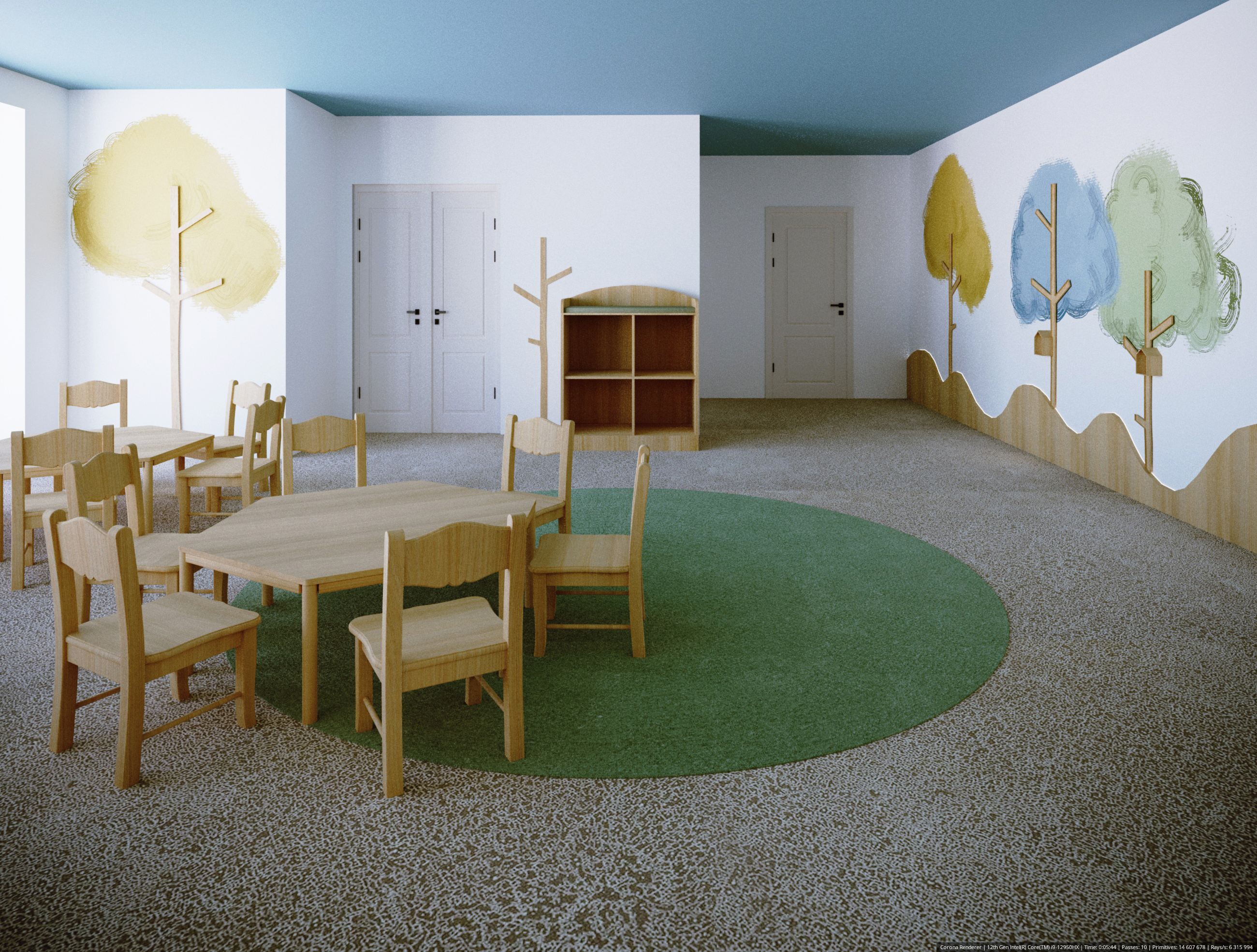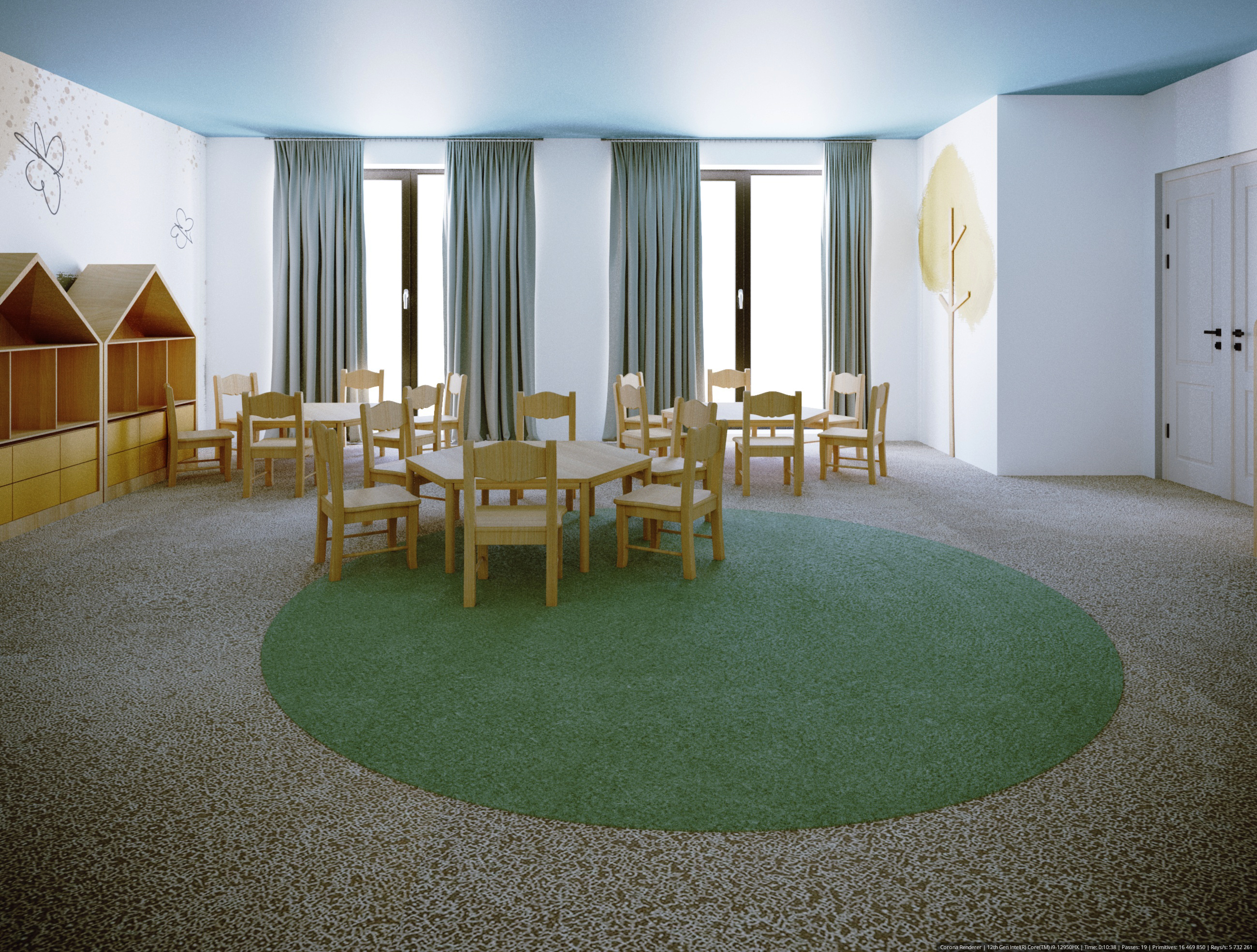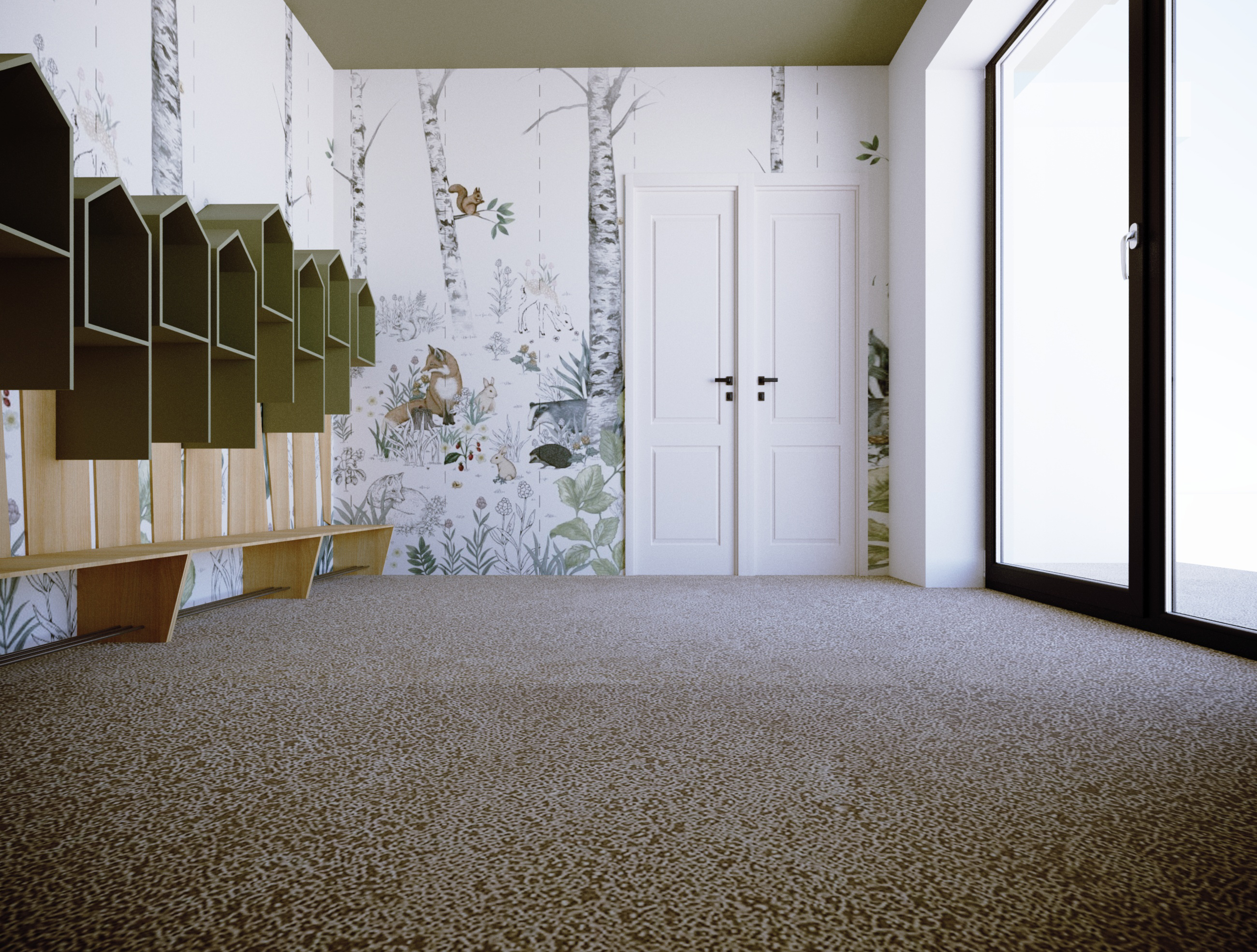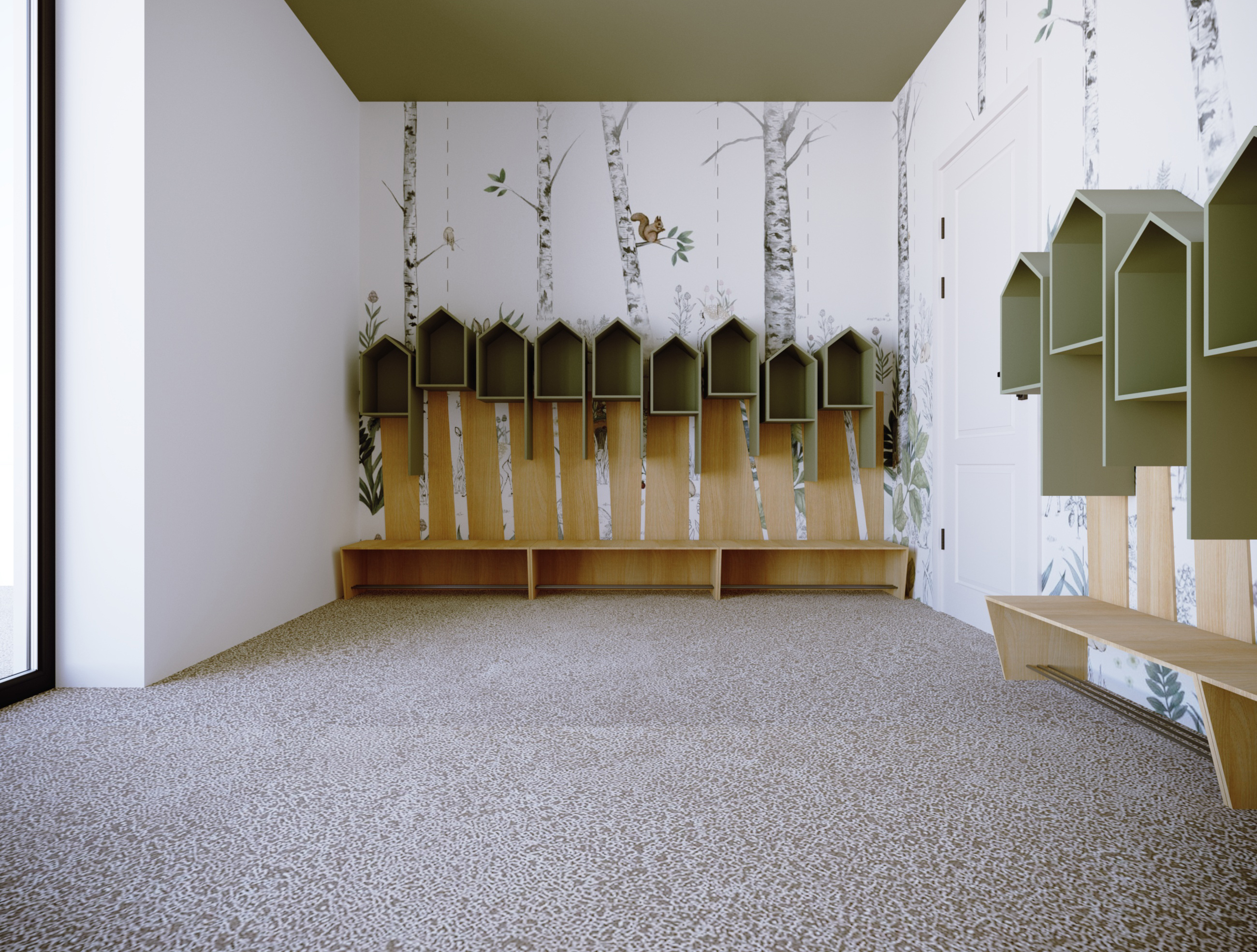 Projekt Żłobka „Bystre Smyki” – Tworzymy Przestrzeń dla Rozwoju Maluchów! Celem w tym żłobku było stworzenie przestrzeni, która nie tylko zachwyca wyglądem, ale także wspiera rozwój i bezpieczeństwo najmłodszych, oraz można ją dostosować z dekoracją natury i cyklu miesięcyw roku.. W żłobku „Bystre Smyki” zaprojektowaliśmy wnętrze pełne natury, harmonii i inspiracji do odkrywania świata. Jasne, pastelowe stonowane kolory, delikatne akcenty w postaci drzew i domków dla ptaszków na ścianach, a także przytulne kąciki dla dzieci sprzyjają poczuciu komfortu i bezpieczeństwa. Układ Funkcjonalny oraz każdy detal został starannie przemyślany. Praktyczne półeczki i schowki, ergonomiczne stoliki oraz siedzenia – wszystko to zaprojektowane z myślą o wygodzie i funkcjonalności. Elementy natury, takie jak motywy drzew i domki dla ptaszków, wprowadzają spokojny, przyjazny klimat, a dzieci mogą poczuć się jak w bajkowym lesie. Projektowanie żłobka to wspaniały proces twórczy, ale też wymagający doświadczenia i wyczucia. Wiemy, jak przekształcić przestrzeń w przyjazne środowisko, które wspiera rozwój i wyobraźnię dzieci. Zapraszamy do współpracy, aby wspólnie stworzyć wyjątkowe miejsce dla maluchów, gdzie pierwsze kroki w świat będą pełne radości i bezpieczeństwa.